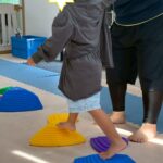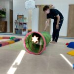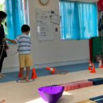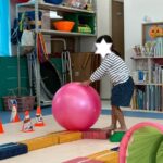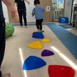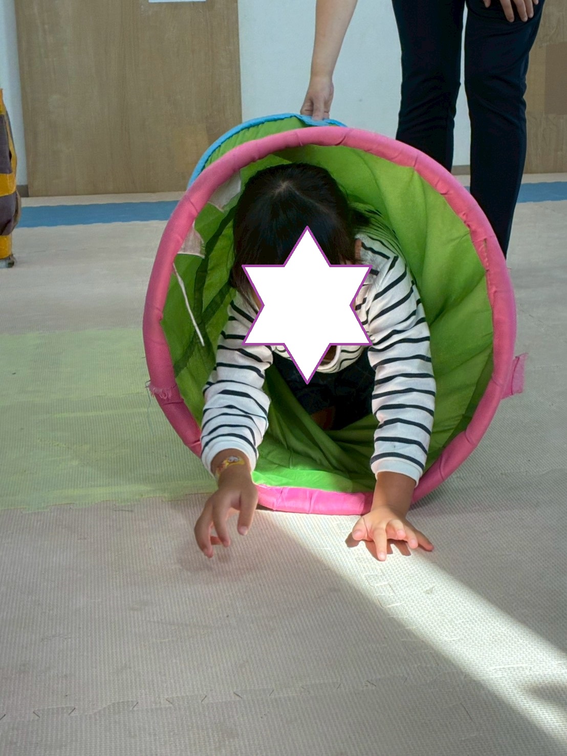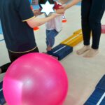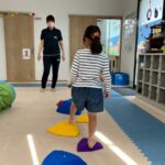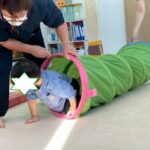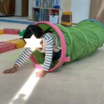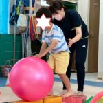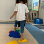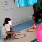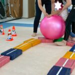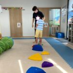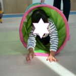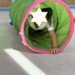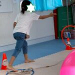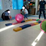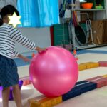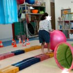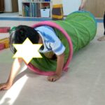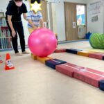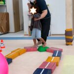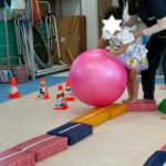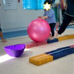 カラーストーンをそっと渡り、トンネルを潜ります。大玉転がしでは、平均台の上を歩きながら慎重にボールを転がして進んで行きました。