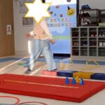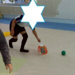 うちわを使ってボールをゴールに運ぶ運動です。