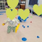 教室の真ん中にはカラーボールや平均台、マーカーコーンなどカラフルな運動用具がバラバラに置いております。『だるまさんがころんだ♪』と先生が言っている間に自分のフープの色と同じ運動用具を集めます!